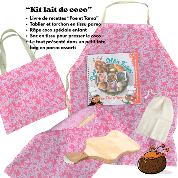 Il comprend un tablier et un torchon en pareo (plusieurs coloris au choix), une râpe coco spécialement conçue pour les enfants par “Lutins des Îles”, ainsi qu’un sac en tissu pour presser le coco.
